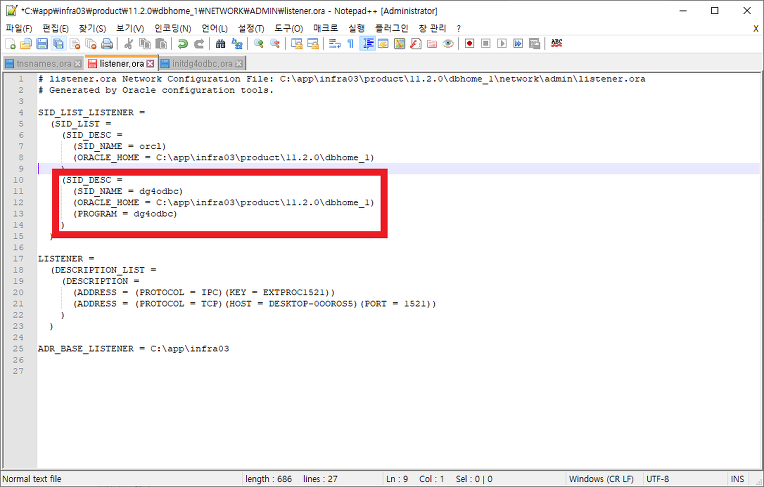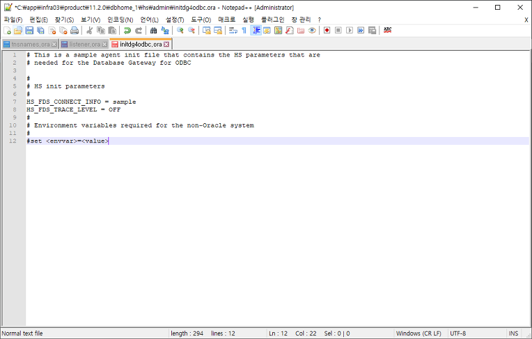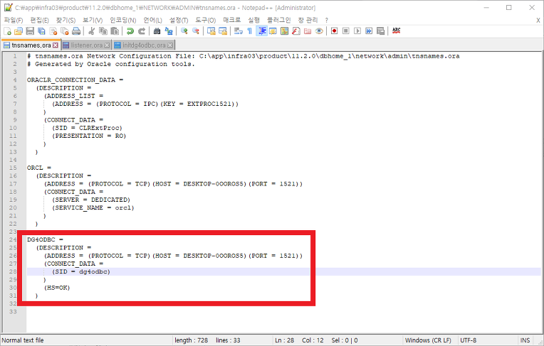 오라클 데이터베이스 설치는 전부 기본 설정으로 했고 아래의 설정파일만 수정했습니다.