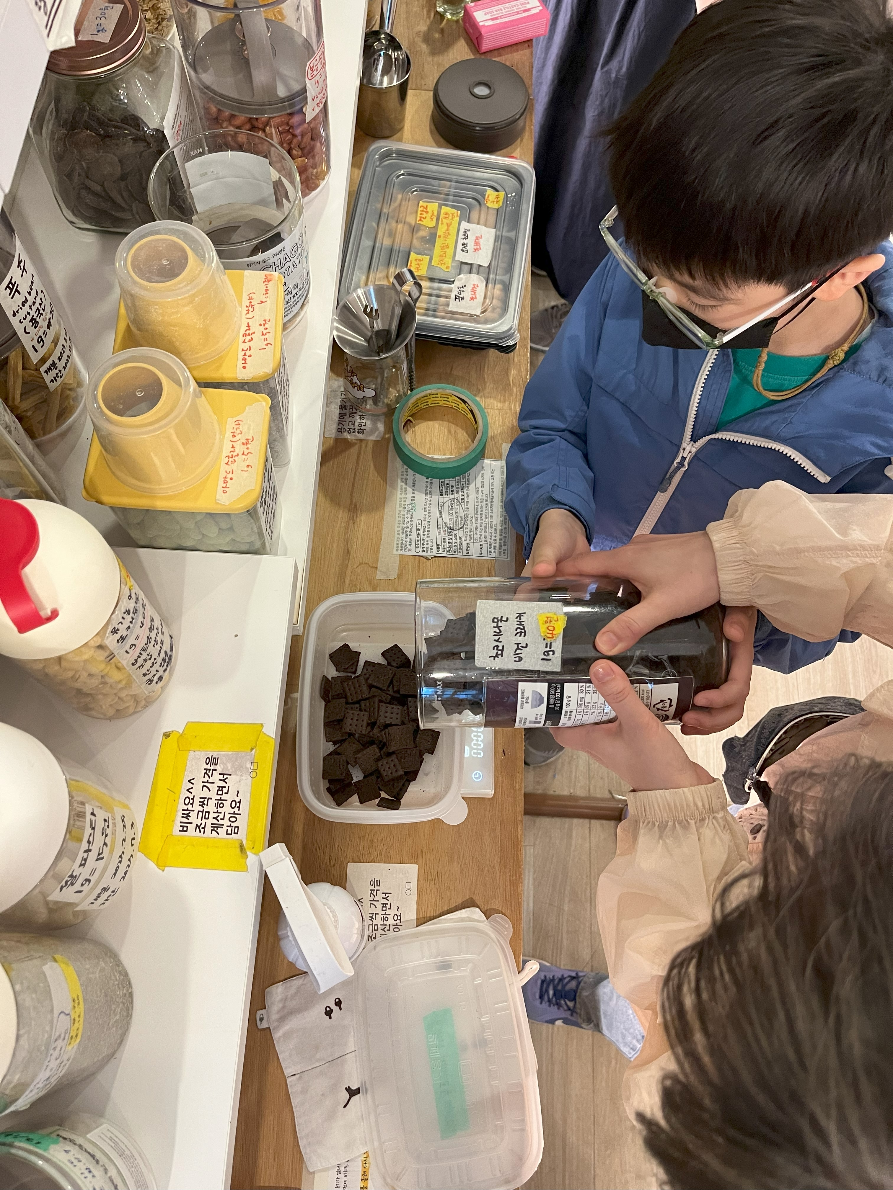 알맹상점에서는 세제, 샴푸외에 식품도 판매하고 있습니다. 식품은 주로 유리병이나 항아리에 담겨 있는데 세제를 구입하는 것처럼 원하는 만큼의 양을 담아서 나중에 같이 계산합니다.